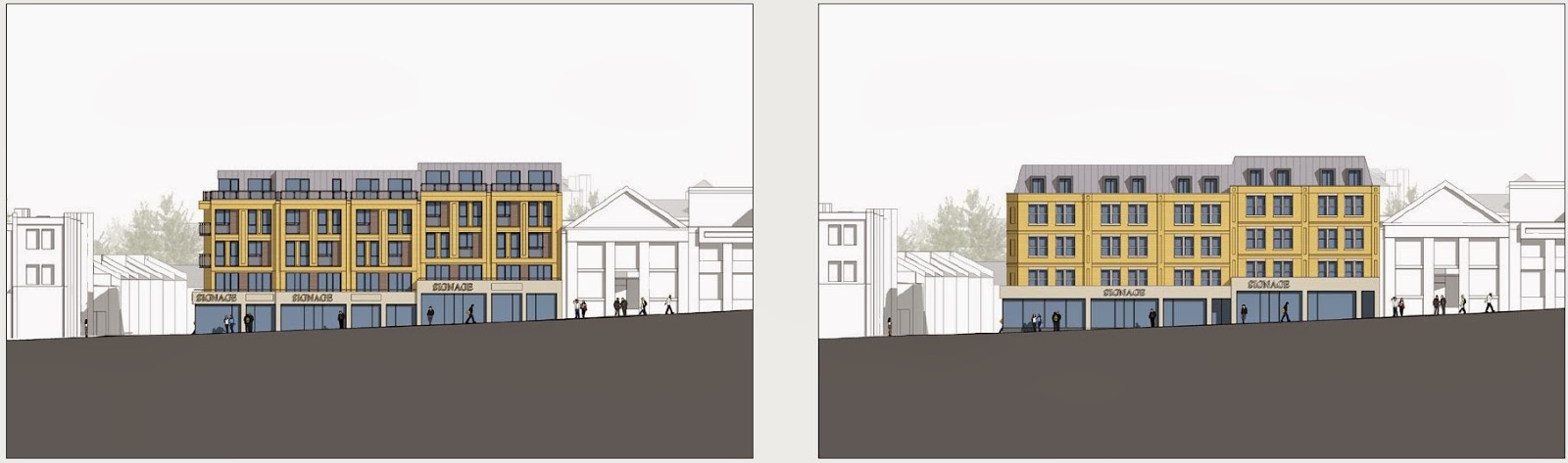 The plans at the moment show two commercial units – the corner unit where Mario’s is looks like it would be extended slightly, with the other units would be merged into one.