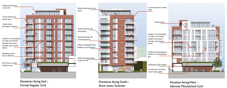 The design of the wall running from West End Lane to the station has been adjusted – and will now be a flat wall rather than with “profiled bricks”. There’s been an invisible change to some water flow issue and the zinc roof is becoming aluminium, so will look different from above but not from ground level (makes you wonder why they went for zinc in the first place).