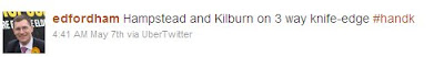 The three candidates are existing Hampstead & Highgate MP Glenda Jackson (Lab), Chris Philp (Con) and Ed Fordham (LibDem). Only Fordham is on Twitter, where he directs followers to blog entries about local architecture as well as to political material.