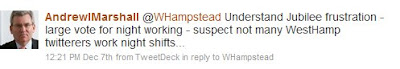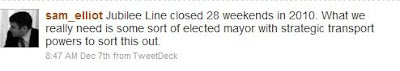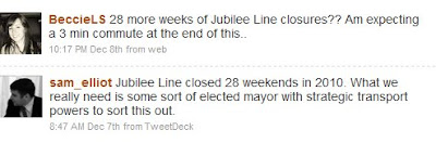 Inevitably, we learned that the Jubilee Line engineering works were going to overrun. Tube Lines (the contractor) and TfL argued the toss over who is to blame, but residents are forced to face 10 more weekends of disruption. The Bakerloo Line is the next to have long-term work, and we can only hope that we never get the Jubilee, Bakerloo and Metropolitan lines all down on the same day. LibDem PPC @edfordham was forthright in his view, while @dasilvajums mused as to how the rail replacement services affected TfL’s carbon footprint.