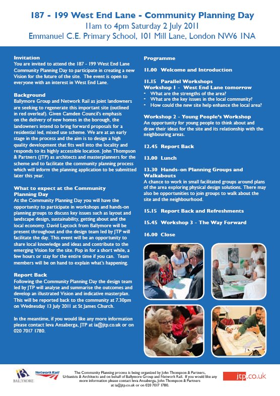 I’m not going to go into all the details of what an NDP is here, partly because there are many issues still to be clarified (there’s a bit more here), but it’s part of the Localism Bill that’s going through parliament at the moment. The general idea is to give people more power over local developments, although almost certainly not as much as many people would like: the plan must fit in with the borough’s plan, the London plan (which has already earmarked West Hampstead for intensification and 800 new homes) and national planning strategy, and it cannot propose less development, only more or a redistribution of sites.