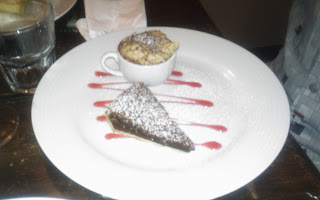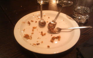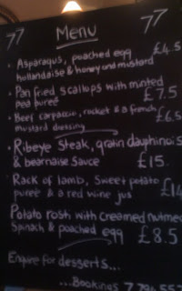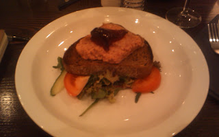 A gang of cheery West Hampstead locals descended upon The Gallery in Broadhurst Gardens to drink wine, talk rubbish, and have a bite to eat on Saturday night. I’d already had dinner of sorts (something I kept quiet), but the menu tempted me, partly as I’d been meaning to try the Autumn salad for a while. Tangy, creamy goat’s cheese worked well with little bricks of sautéed sweet potato, on a bed of leaves (salad ones, not leaves from the pavement outside). At £7, it wasn’t too expensive a dish, but for me a little light; next time I’ll happily eat the same, but accompanied by breads or chips.