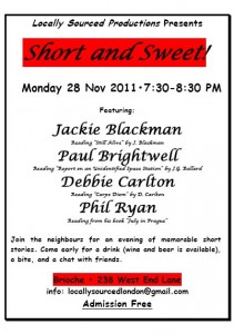 While I have your attention, I just want to publicly thank a few local stars: Elias at David’s Deli who packed the audience in for many months and continues to support this endeavour down at La Brioche, where we moved three events ago; photographer and neighbour Dominic Lee who so generously prints the posters I hope you see in the window at La Brioche advertising the events; Roger Evans, our delightful host at La Brioche, and you, who come out on the occasional Monday night to meet up, support the talent, and make West Hampstead an especially wonderful place to live. If you have any ideas for events or want to participate yourself, let me know.”