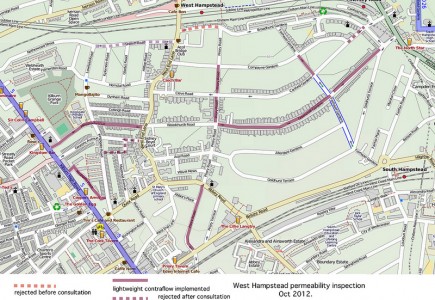 | Camden Cyclists’ map of contraflows (accepted and rejected) Click for larger version |