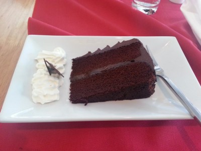 Across the table, my friend (coincidentally somewhat comically named Mark Italy) very much enjoyed a chicken dish (with neat little fine-cut chips) in an apparently excellent dark and devilish sauce; I forget exactly what was in it, as by this time I was getting properly stuck into the wine, an Italian Pinot Noir which was an absolute delight. Tangy and refreshing, with a sour edge – I could have happily self-medicated with two bottles of the stuff with my main and another with dessert. (Checking the menu at http://www.tuttobene.co.uk/menu/, I now note that Mr Italy’s dish was pan fried chicken breast with peppers, onions, olives, mushroom & tomato. Let’s add a point back on for including olives in the sauce).