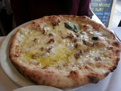 A ‘white’ (no tomato base) pizza of porcini mushrooms, rocket, pecorino shavings and truffle oil was also a success, being pretty-much perfect (though inevitably customised by madam, who requested removal of Italian sausage) – in fact far better than a similar variant I tried earlier this year, which (very uncharacteristically, I gather) was rather flabby and lacking seasoning.