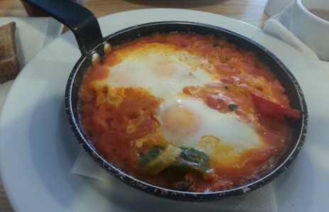 This Spanish variant is described on the menu as pan-“fired” peppers, onions and coriander, simmered in tomato sauce and somehow “toped” with three eggs! Regardless, it was a merry plate of colourful, flavourful food, with the eggs just-cooked, and all served still sizzling in a pan – most satisfying.