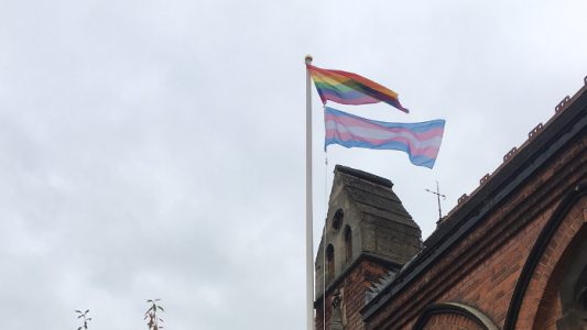 Thanks to the help of the fire brigade St James Sherriff Road once again had it’s LGBT rainbow and trans flags fluttering in the West Hampstead breeze this afternoon. Although it was a brigade from Wembley not West Hampstead that lend a ladder.