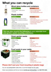 Still ‘no’ to soft plastics like dry cleaners’ coverings and junk mail wrappers. Caddy liners? ‘They don’t last a fortnight. Change them weekly.’ Light bulbs won’t be collected. Rats? ’Keep your receptacle clean.’ (And ‘No comment’ to query about new commercial rubbish collectors springing up across Camden.)