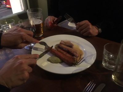 When it came to ordering food, the suggestion is that dishes are ordered ‘for sharing’. Ruairidh is Irish, so appropriately – for a pub in Kilburn – there is an Irish flavour to the menu, with crubeens (deep fried pigs trotters) as one of the starters. We also ordered asparagus (nice and seasonal) with whipped cod’s roe, which had a slight flavour of bacon, and rabbit terrine with pickles. Oh and the spouting broccoli too. Plus home baked sourdough bread. Monika wasn’t a great fan of the cod’s roe but I loved it. And we polished off the lot.