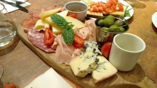 We tried two reds: Aglianico Quartieri 17 – “savoury, meaty notes and plum fruit characterise this dry house red” – indeed it was dry, quite a refreshing wine to start off with, then Piedirosso Pompeiano 20 – “a medium bodied red with hints of strawberry on the nose and strawberry & blackcurrant on the palette” – a similar lightness (12.5% ABV) but with rather more to it, to match up against the grub.