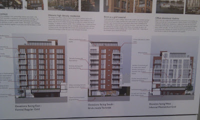 The boards that were exhibited beforehand are now accessible on the architect’s website (see these for issues I haven’t covered here, for example the parks, gardens and environmental issues, or site constraints). Some changes have been made since the last designs were discussed – the “public” square (presumably private space) has been made bigger to accommodate potentially the fillip that is a farmers’ market, and more smaller retail units have been added.