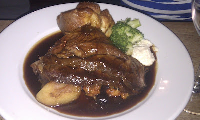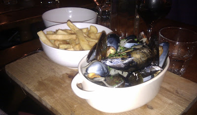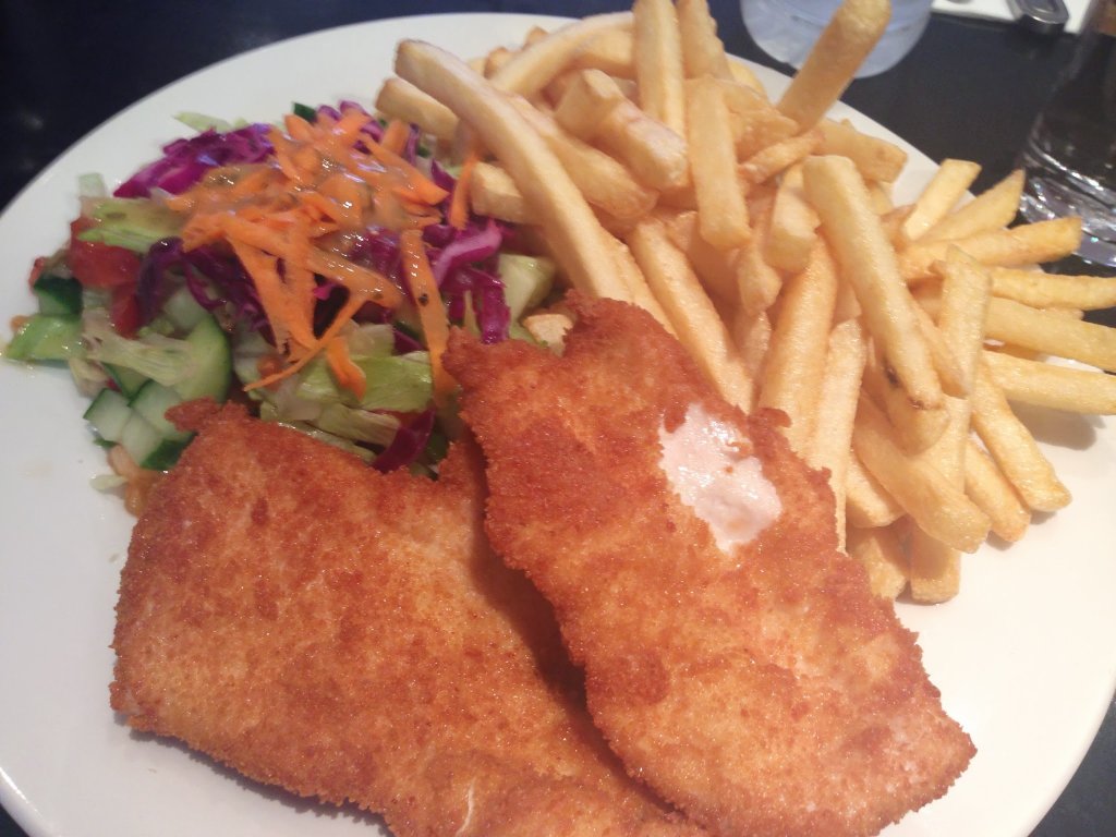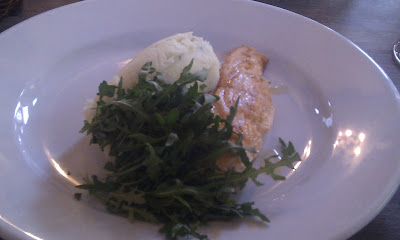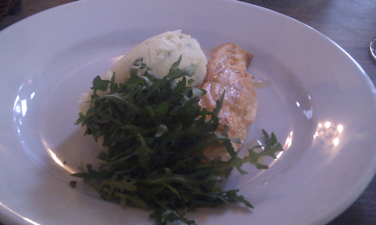 And so to the food – the menu is a strange mix of more interesting dishes such as chicken and artichoke salad, and pub grub staples such as potato skins. Matt and I opted for the tiger prawn special, which came with long strips of pepper and a piquant tomato sauce. The sauce and the peppers tasted fine, the prawns were slightly overcooked and tasted of nothing and were also the smallest tiger prawns I’ve seen. But apart from that it was fine.