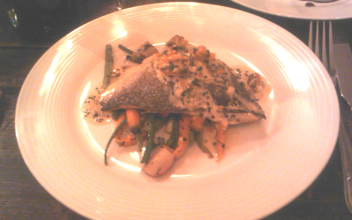 The roast cod special looked the best dish of the night. Tom, Lisa and Sarah all said it was very well cooked, although Sarah thought the portion was on the small side and was lusting after someone else’s side order of diced sautéed potatoes to replace her own boiled new potatoes.